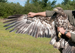 A total of 391 hawks were banded this week including: 1 Bald Eagle, 7 Northern Harriers, 353 Sharp-shinned Hawks, 6 Cooper’s Hawks, 6 Broad-winged Hawks, 4 Red-tailed Hawks, 4 American Kestrels and 10 Merlins. We had three straight busy days with the passage of a front starting on the 10th when daily totals were 93, 142, and 121 birds banded. The highlight was this third year Bald Eagle captured by Chris Neri at the Moose Valley station. Others birds banded included the first adult Cooper’s Hawks and 6 Broad-winged Hawks. The numbers of hawks banded and counted are still lower than normal of many species including Sharp-shinned and Cooper’s Hawks, Red-tailed Hawk and American Kestrel.