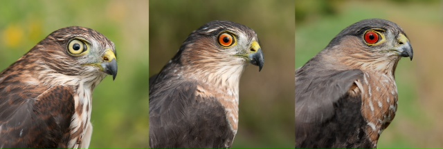 Chris Neri made an interesting photo collage of different ages of Sharp-shinned hawks. As these birds age, their eye changes from bright yellow on birds born this year, to dark red on birds usually older than two years. The photo below shows these changes very well.