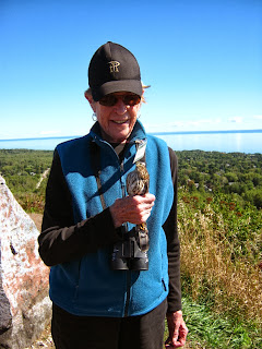 Being a volunteer at Hawk Ridge has many perks. One perk is that you are able to work closely with the amazing birds that are flying passed or getting caught and banded at our banding station. Volunteers are able to hold and release birds that are not being adopted at the overlook. Below are photos of volunteer, Mary Slattery, holding and releasing a juvenile male Sharp-shinned Hawk that was caught at our banding station and brought up to the overlook for education and release.