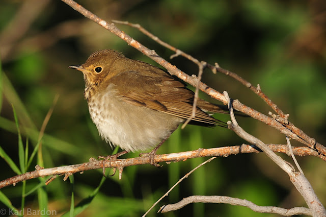 | Swainson’s Thrush resting in early morning light after nocturnal migration |